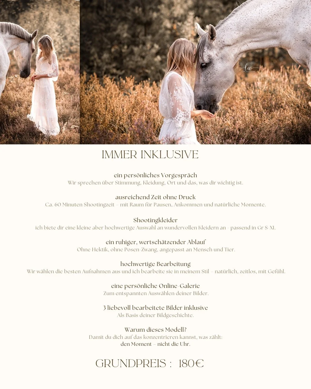 Liebe Laura, danke für den wunderschönen Nachmittag mit Dir und deine traumhaften Bilder 🥰, wusste gar nicht, dass ich so gut aussehen kann 🤗. Ich komme im Herbst sehr gerne wieder auf dich zu, um noch ein paar schöne Momente mit meinen anderen 2 Pferdis einzufangen. Fühl Dich gedrückt und mache weiter so…es gibt kaum was schöneres als unvergessliche Momente für die Ewigkeit einzufrieren 😘. LG Mandy